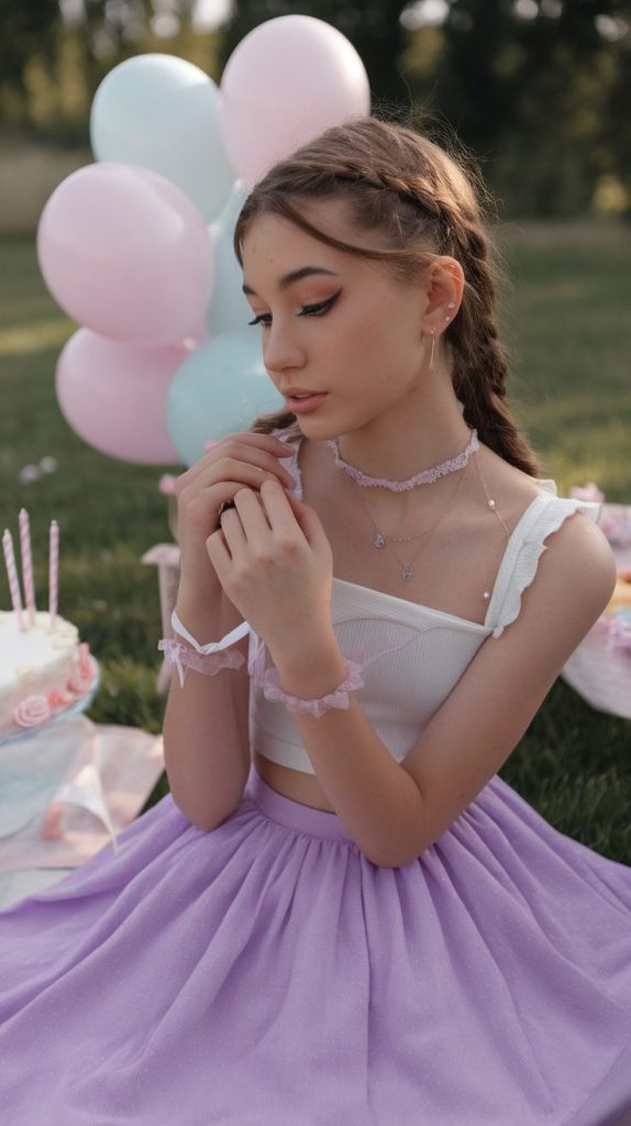 If your Pinterest board screams “soft girl aesthetic,” this look will make your heart flutter. Pastels are soft, dreamy, and perfect for outdoor or daytime birthday parties.