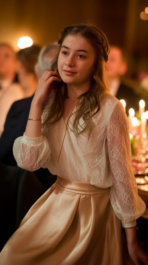 Picture this: a cute satin skirt, a tucked-in lace blouse, and dainty jewelry. Add a headband or sparkly hair clips, and you’ve got a look that’s mature but still very age-appropriate.