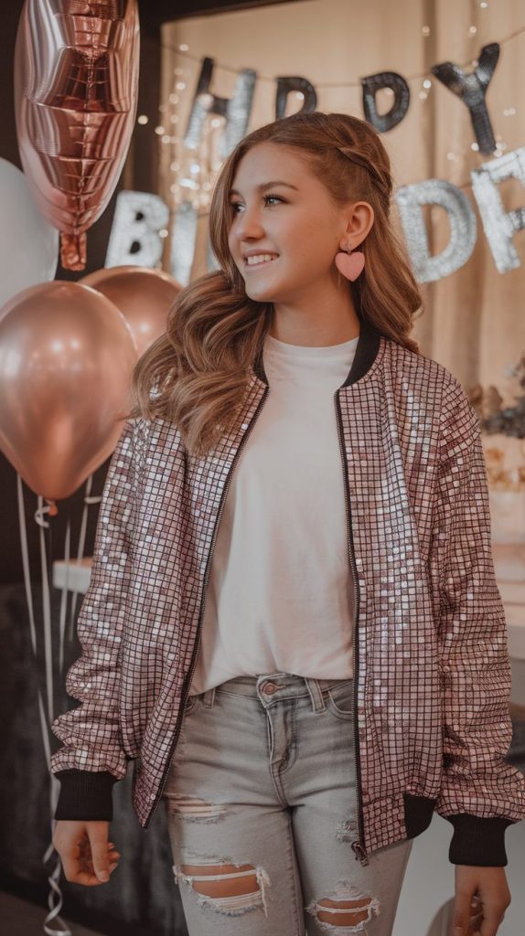 Imagine this: basic white tee, ripped jeans, sneakers… and then BAM—throw on a sequin bomber or colorful varsity jacket. Suddenly, it’s birthday-ready.