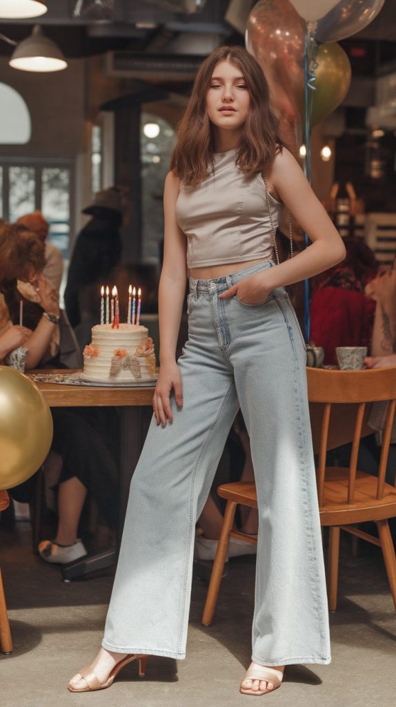 Think high-waisted wide-leg jeans, a silk or satin crop top, and some statement earrings. Finish it with heeled sandals or chunky sneakers—depending on your vibe.