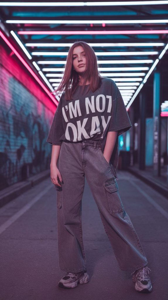Pair an oversized graphic tee with a mini skirt or cargo pants. Add chunky boots or platform sneakers, and layer with a denim or leather jacket.