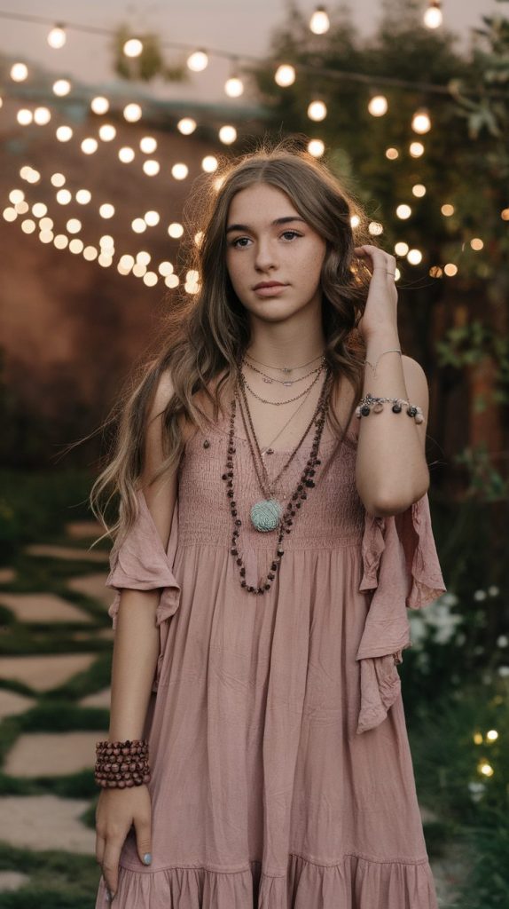 Think flowy maxi dress, lace detailing, and layered jewelry—maybe even a flower crown or woven hat for that festival-style touch.