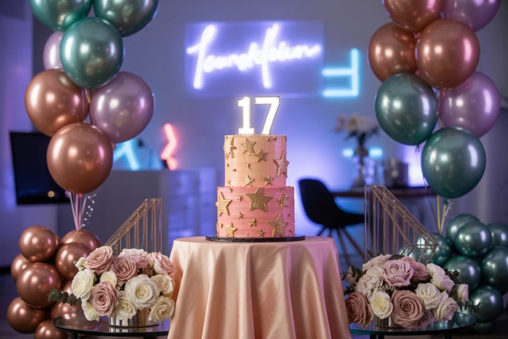 To make it extra personal, add a “17 memories” photo wall filled with snapshots from past years. This style makes the night classy without losing the fun.