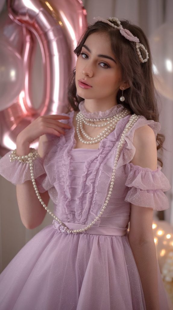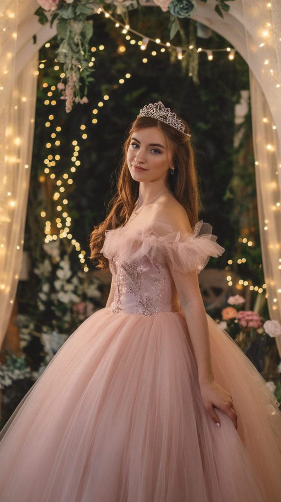 Soft pastels like lavender, blush, or champagne look stunning, especially for outdoor or garden parties. Add a tiara, delicate jewelry, and maybe some soft curls, and you’re practically glowing.