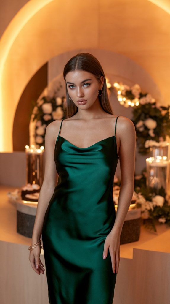 Now, if sparkles aren’t your thing and you prefer a softer, more mature vibe, the satin slip dress is your best friend. Think soft champagne, dusty pink, or emerald green. The silky fabric gives that effortless “I woke up like this” glam—without even trying.