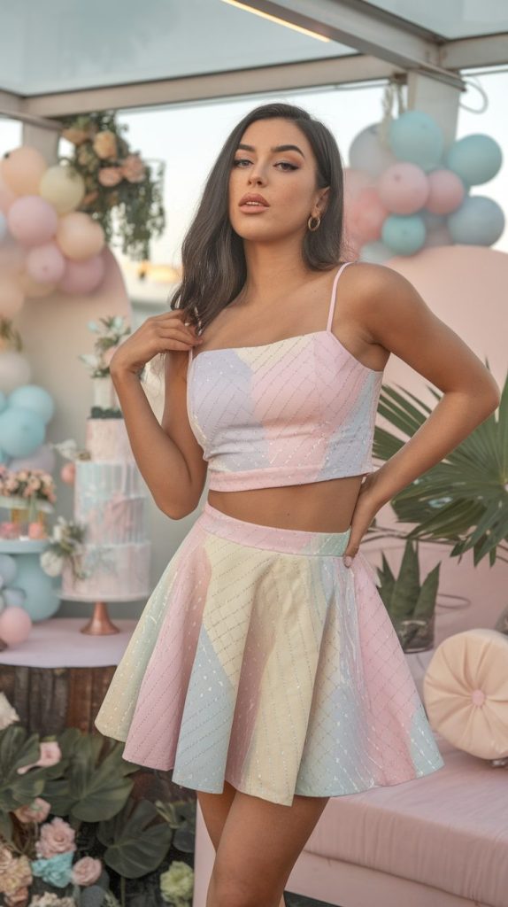 - A crop top and mini skirt combo for a fun party vibe.