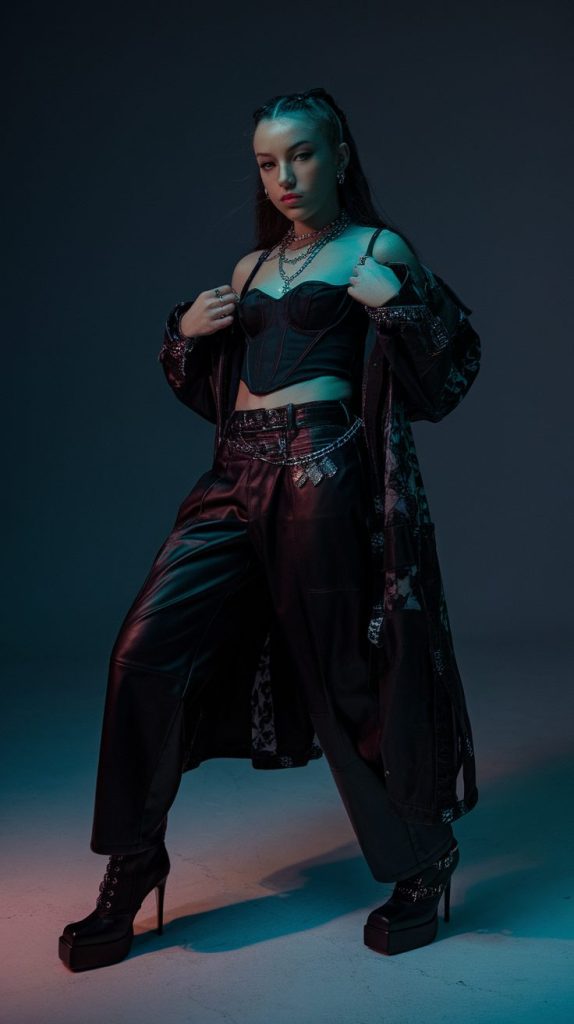 Think black leather pants, a corset or off-shoulder top, and heeled boots. Add silver jewelry and smoky eye makeup, and you’ll instantly look like the cool girl everyone’s secretly obsessed with.