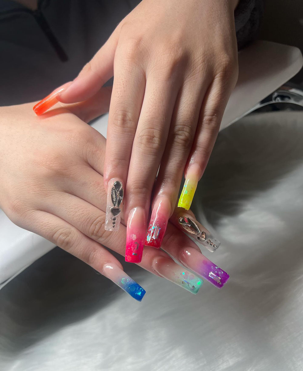 Okay, this one’s totally stealing the show already. The mix of bright rainbow ombré tips with pops of glitter feels like throwing your own mini party on your nails. It’s vibrant, fun, and exactly what a 20th birthday deserves—colorful energy all around. The silver 3D accents add that little luxe vibe too, so it’s not just playful but also has a glam touch.