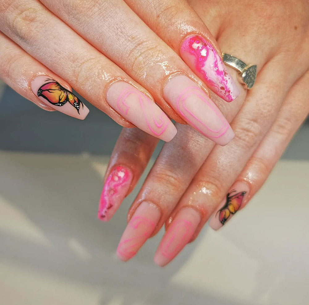 Think romantic flowy dresses, crop tops with denim skirts, or even a neon handbag to play off the pink tones in the design. These nails were made to flutter in the spotlight.