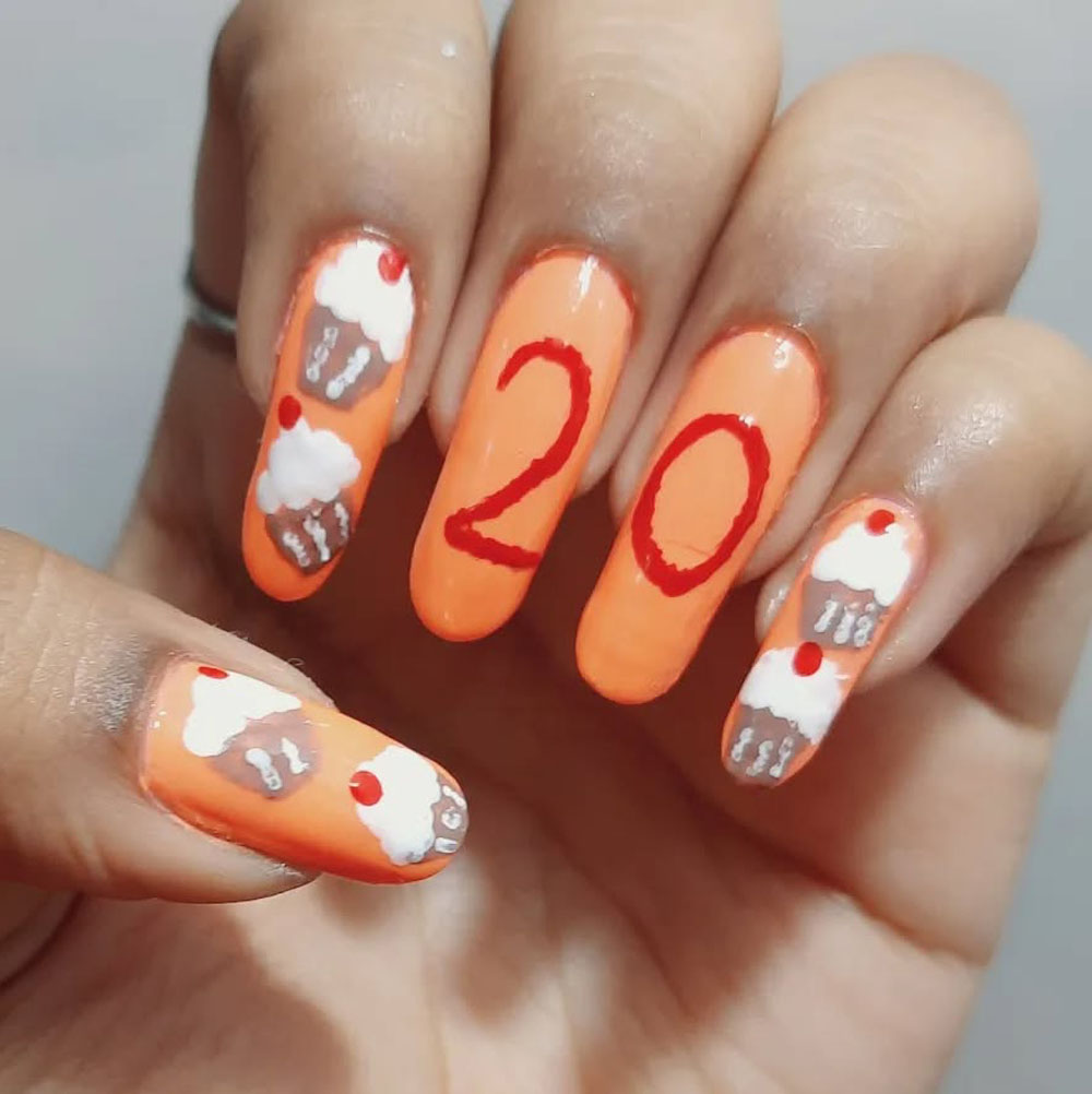 This one is like a little slice of birthday cake on your fingertips. The bright orange base with cute cupcake accents and a bold “20” in red is fun, festive, and perfect for a low-key party vibe.