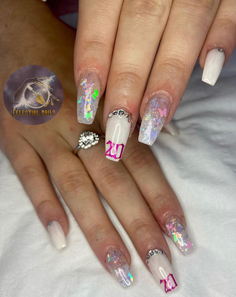 Can we talk about dreamy? These iridescent nails with soft white bases and pops of holographic butterflies are pure magic. The sleek “20” in hot pink adds just the right amount of birthday energy without being too loud.