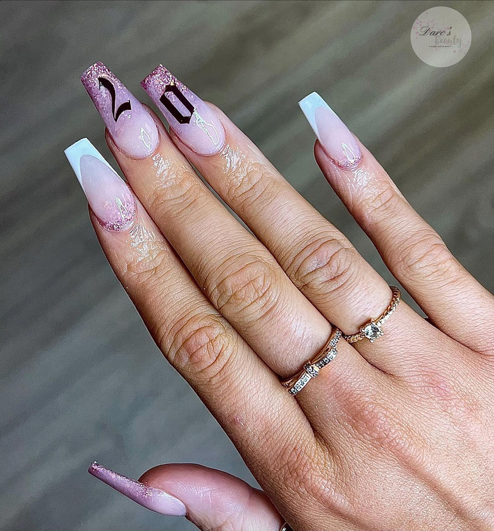 This one’s for my minimalist queens who still want a touch of sparkle. The nude-to-pink ombré with glitter tips and sleek black “20” lettering is classy but still festive enough for your big day.