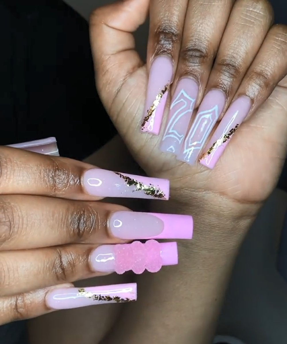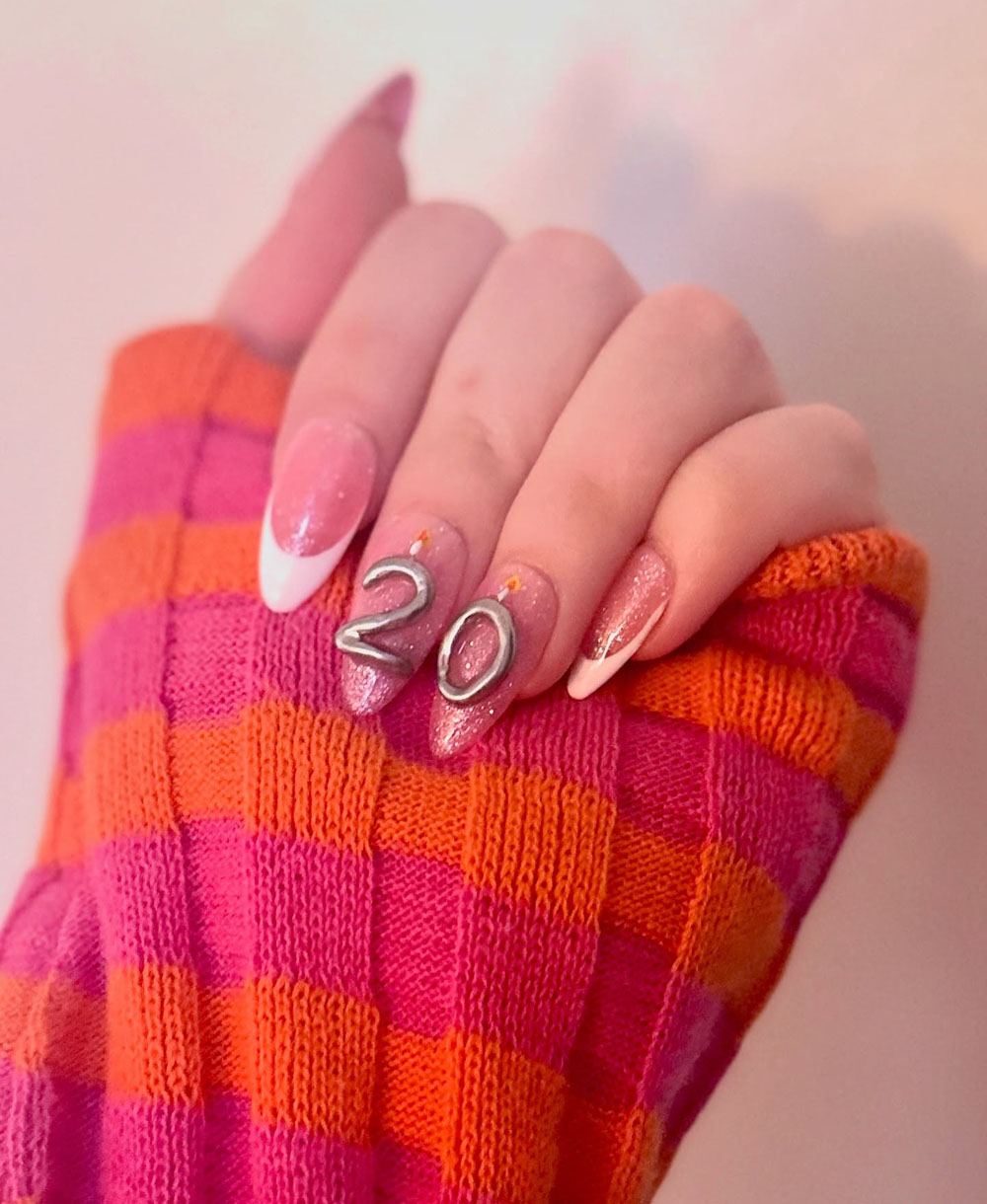 This one is giving grown-up princess vibes. The glittery pink tones mixed with classic French tips and that bold metallic “20” bring just the right amount of birthday glam. It’s sweet but still feels a little elevated.