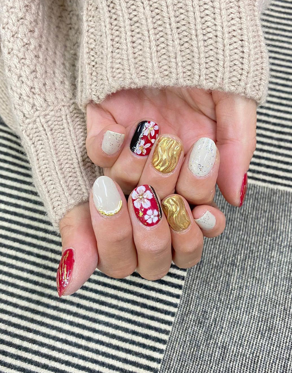 Say hello to major artistic energy. This mix-and-match design combines red, black, gold, and delicate cherry blossoms for a set that feels fresh, fashionable, and full of texture. It’s like wearing a mini art gallery on your nails.