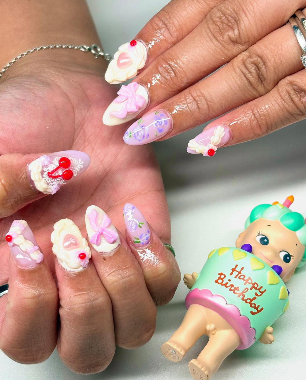 This is pure birthday magic. The 3D pastel bows, cherries, and icing details make these nails feel like tiny birthday cakes on your hands. It’s dreamy, nostalgic, and absolutely adorable.