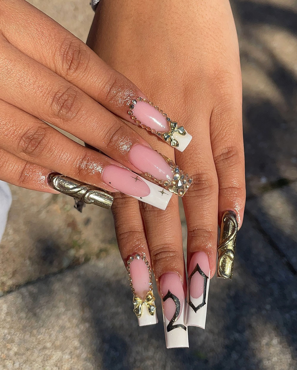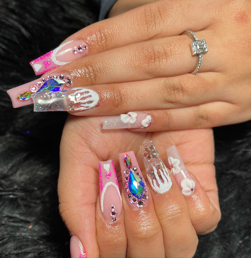 Here’s your crown moment. These nails combine classy French tips, pink undertones, rhinestones, and gold charms for a set that says “I’m the main event.” It’s elegant but makes a serious statement too.
