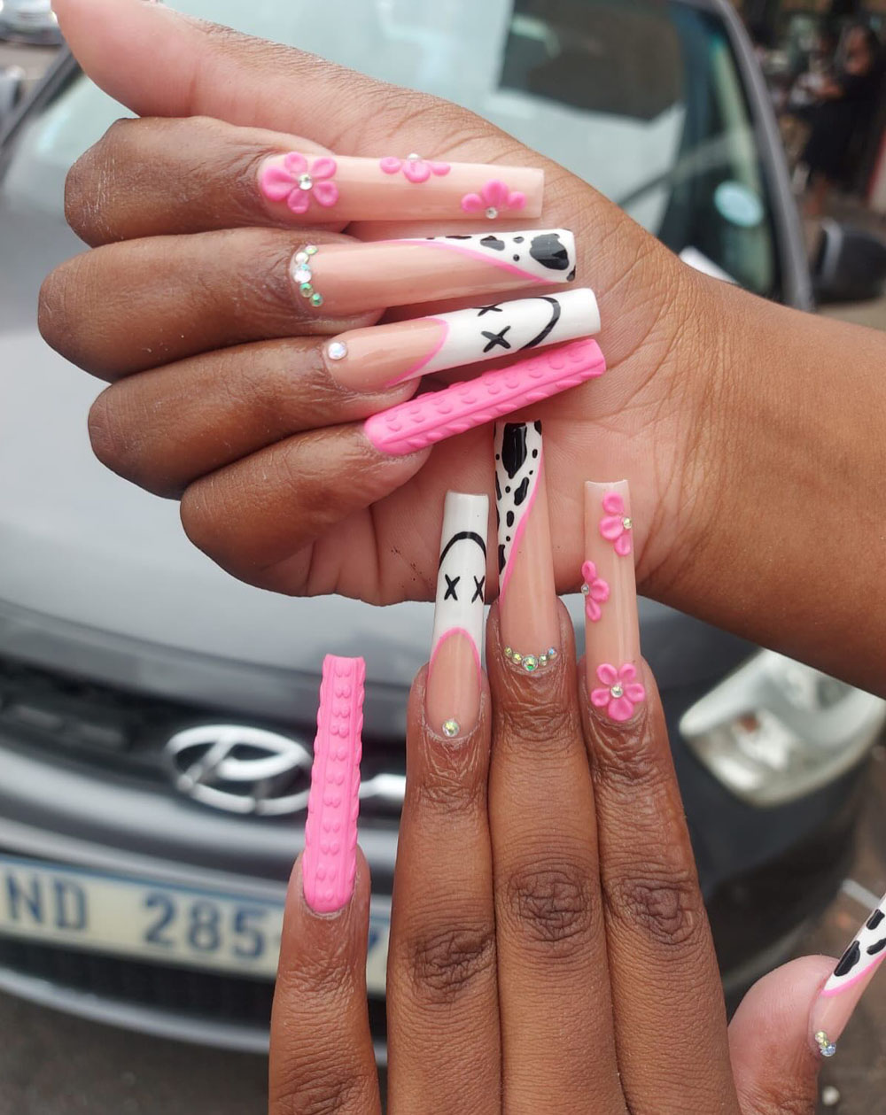 Match them with a bubblegum pink dress, denim overalls, or even keep it casual with joggers and a crop top. These nails are all about celebrating with a smile.