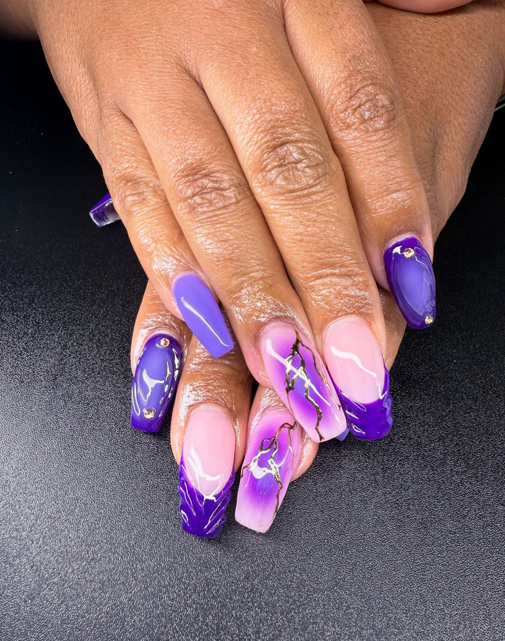 Here’s a set that brings major party vibes. The bold royal blue paired with hot pink, rhinestone accents, and marbled ombré nails scream confidence. It’s the kind of design you rock when you’re ready to own the dance floor.