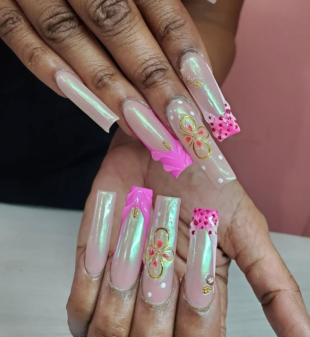 This design is a dreamy mix of pearly pink polish, gold floral accents, and 3D textured details. It’s romantic, flirty, and has a touch of vintage glam.