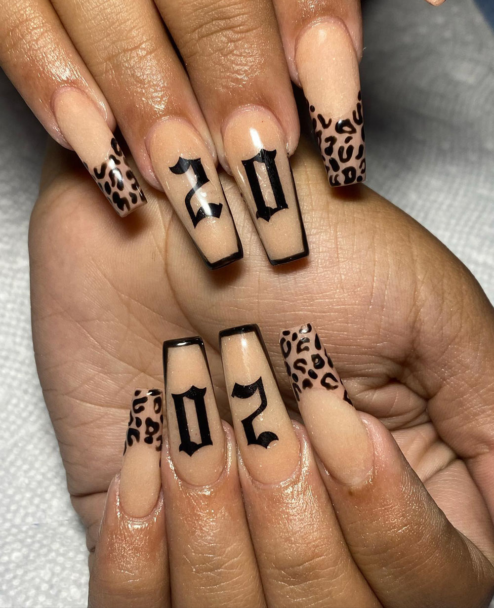 Here’s a fierce one for the birthday baddies. The nude base keeps it chic, while the bold black “20” and “02” plus leopard-print French tips add pure sass. It’s edgy, stylish, and says, “Yeah, I’m 20, and I came to slay.”