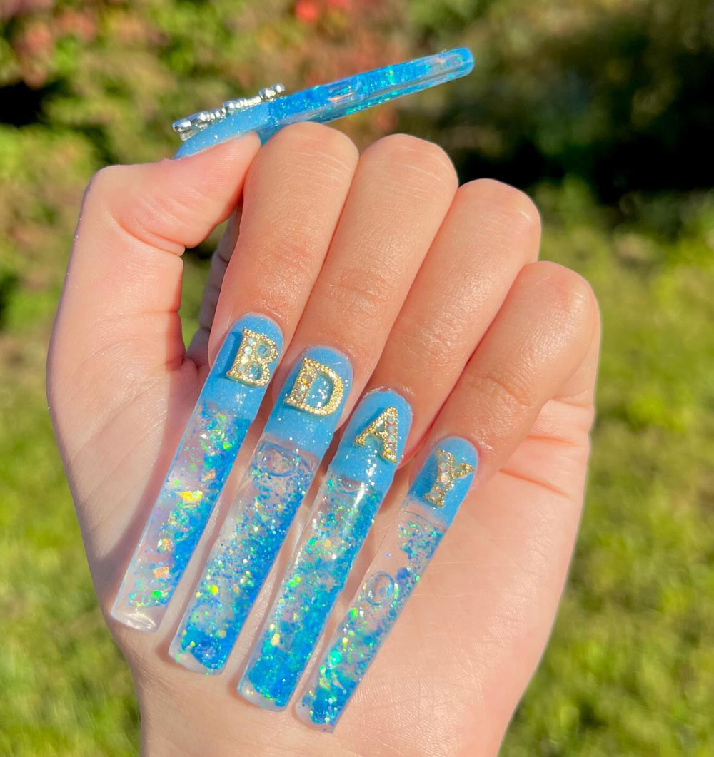 Ready to bring the chill birthday vibes? These icy blue nails with “BDAY” in sparkly gold letters totally nail the theme (pun intended). The mix of glitter and clear accents makes them shimmer like sunlight on water. This one feels perfect for a sunny outdoor party or poolside celebration.