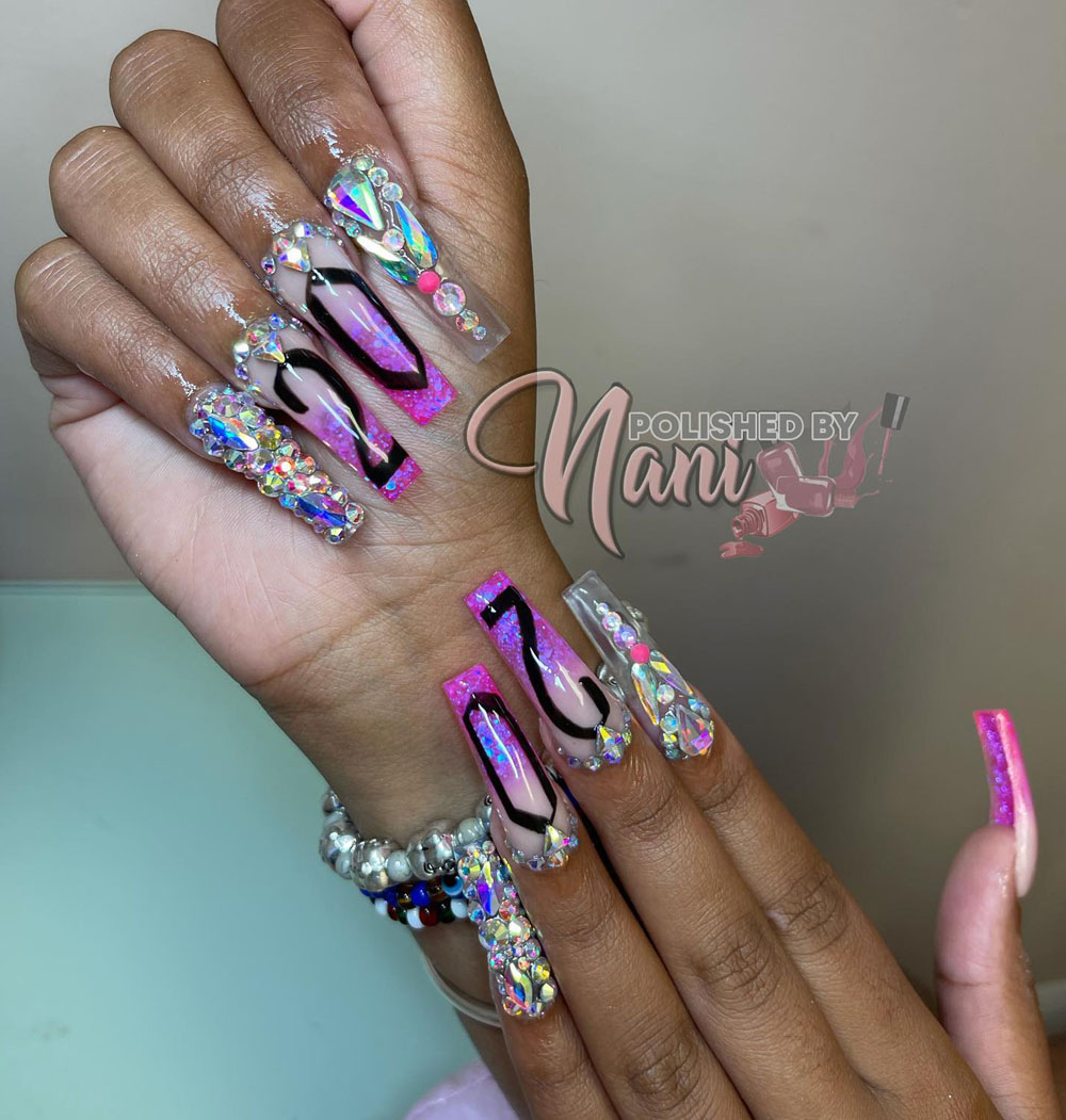 This is where birthday glam meets full-on diva energy. Between the oversized rhinestones, chrome shine, and bold “20” numbers, these nails don’t whisper—they scream main character vibes. The hot pink ombré and black accents keep things edgy and sophisticated.