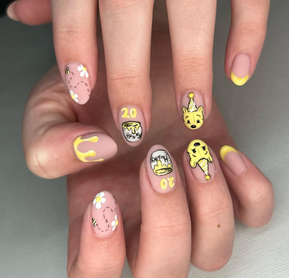 OMG, how adorable are these? These nude nails bring Winnie the Pooh to life with honey pots, balloons, and the cutest little birthday hat. Perfect for the girl who wants her birthday nails to be playful and nostalgic.