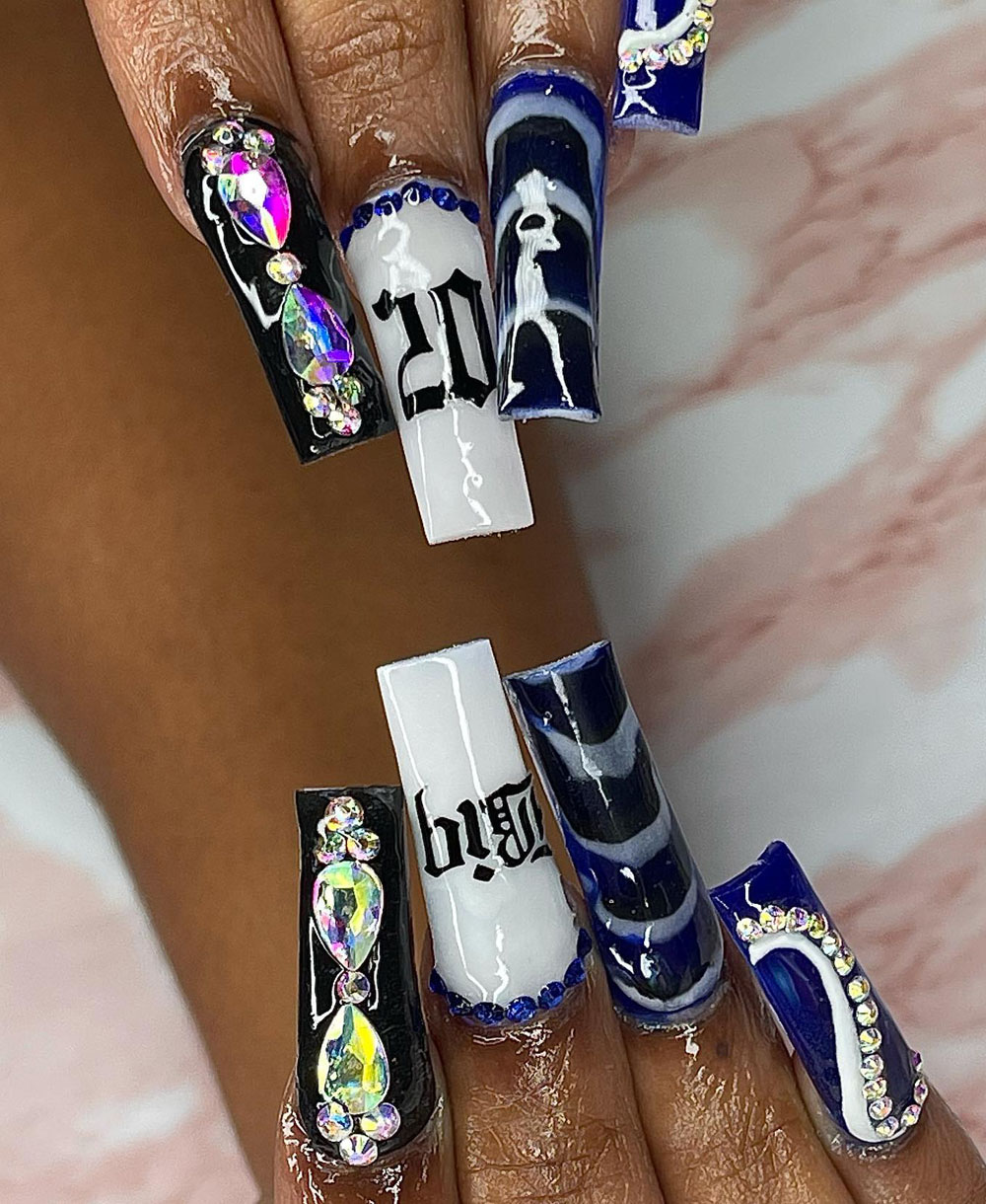 Ready to turn heads? These dramatic blue-and-black nails with sparkling rhinestones are unapologetically bold. The intricate designs and “20” lettering make it impossible not to notice you’re celebrating.