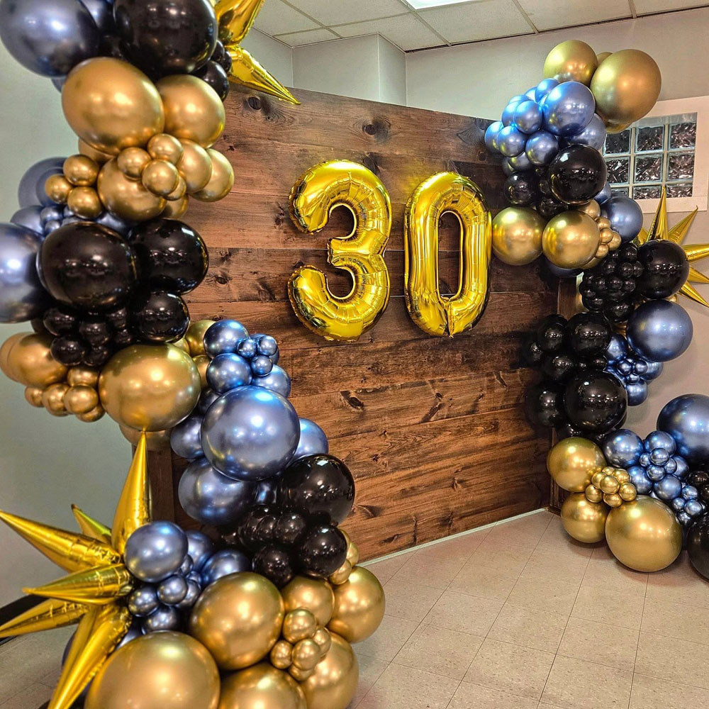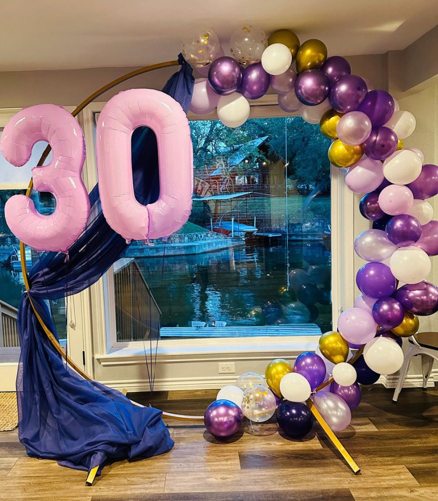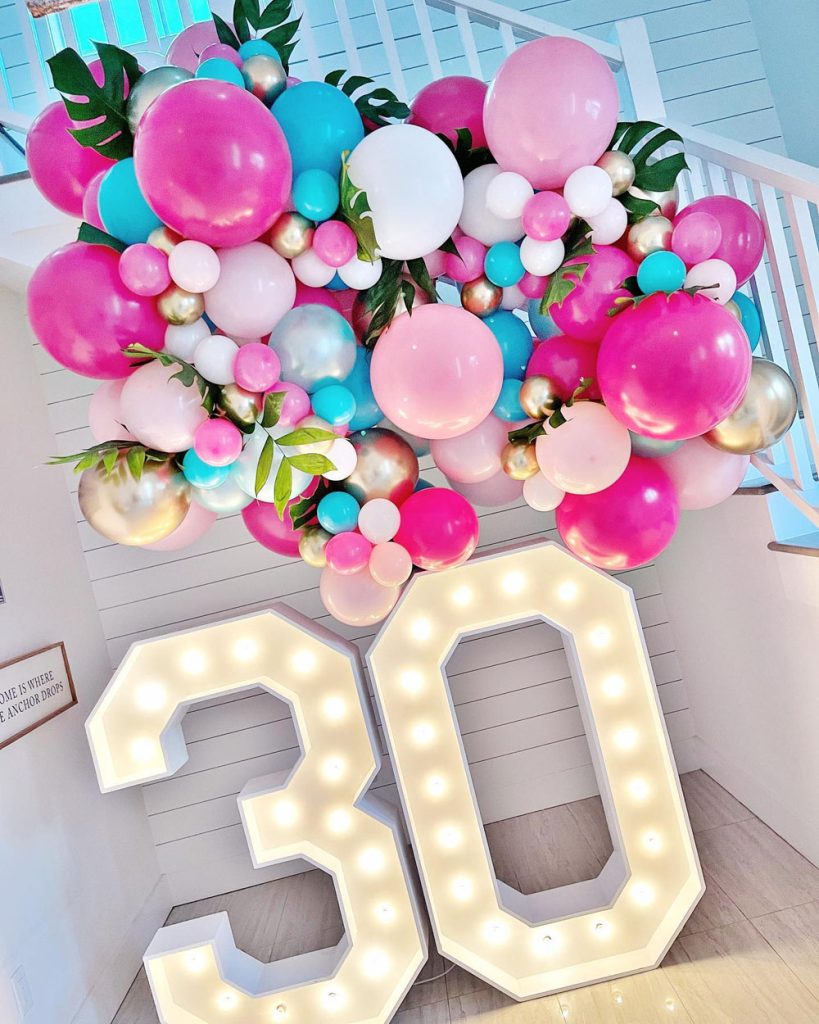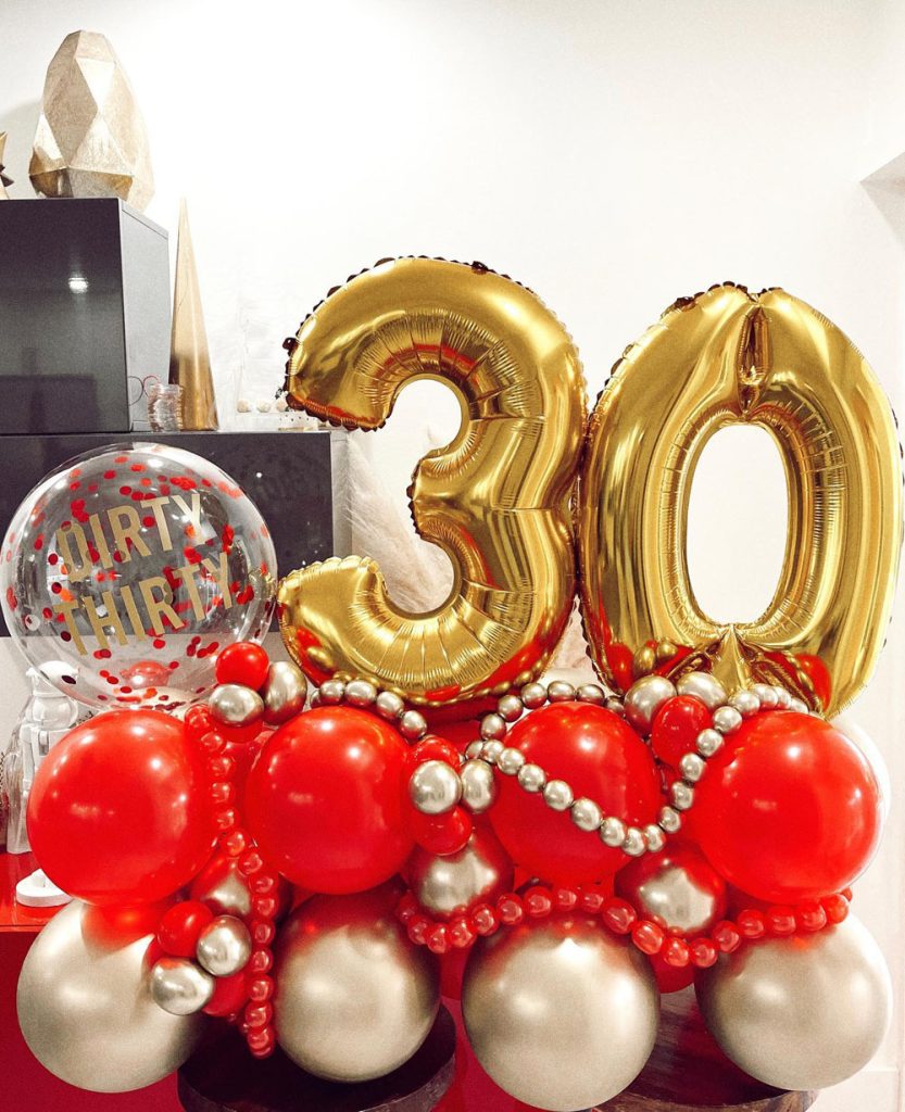 Here’s a decor move that instantly levels up any party: go wild with a balloon arch. Mix in metallics, oversized numbers (hello, 3-0!), and glitter accents for a space that screams celebration.