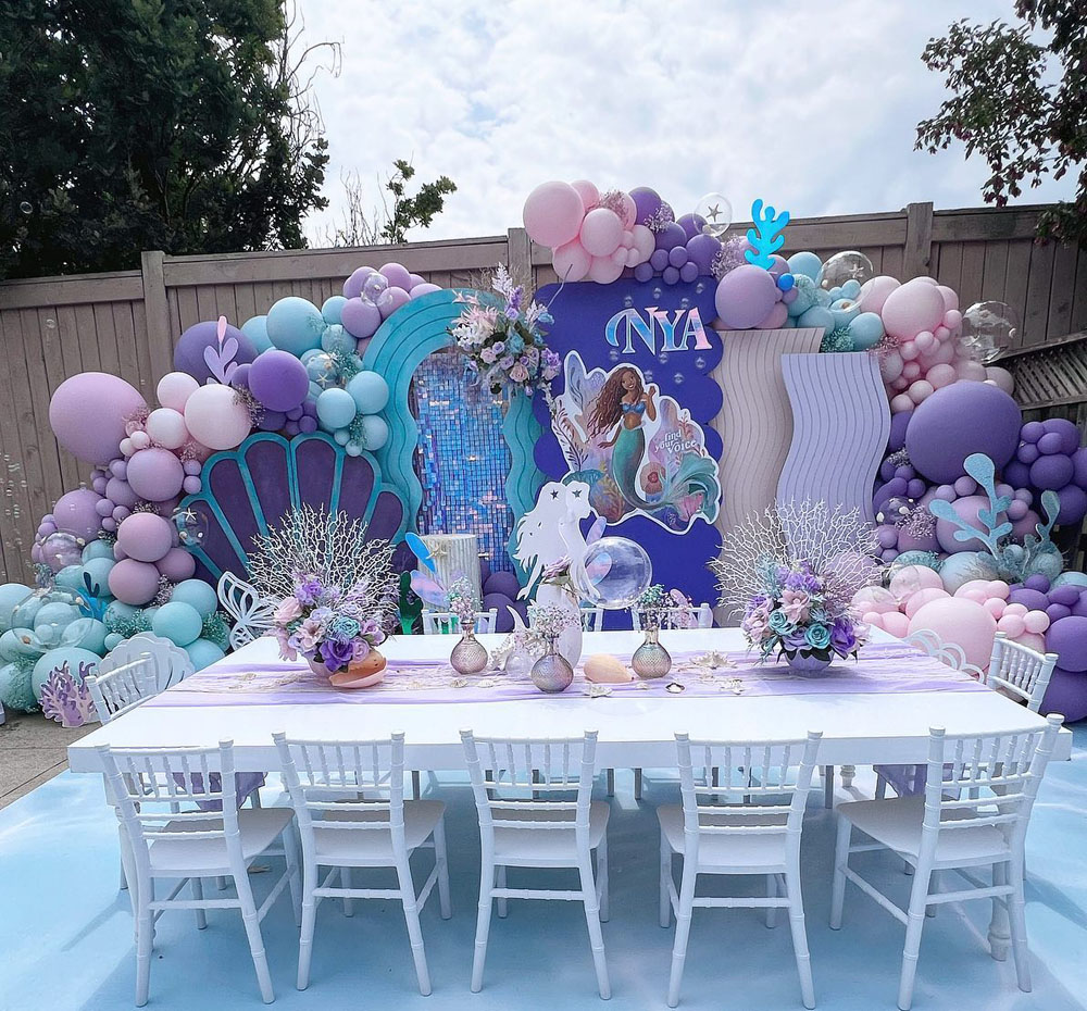 For a splash of underwater fun, a mermaid lagoon theme is the way to go! With ocean-inspired decor, seashells, and sparkly touches, this theme is perfect for a watery wonderland. Think bubble machines, a mini “sea” treasure hunt, and mermaid tail photo ops!