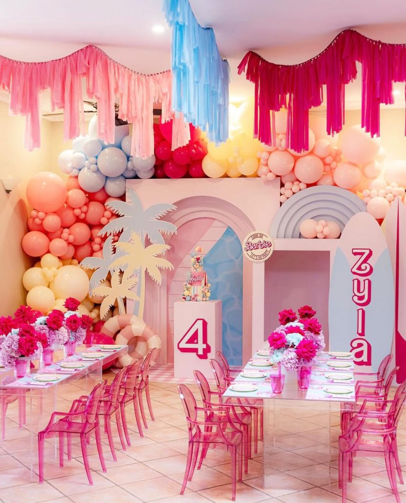 Time to get fabulous! A Barbie-themed birthday is all about glitz, glam, and living the pink dream. Deck out the space with sparkly streamers, a hot pink backdrop, and Barbie silhouettes. Set up a “Dreamhouse Corner” with mini dress-up stations — boas, sunglasses, tiaras — and let the kids strut their stuff on a DIY pink carpet.