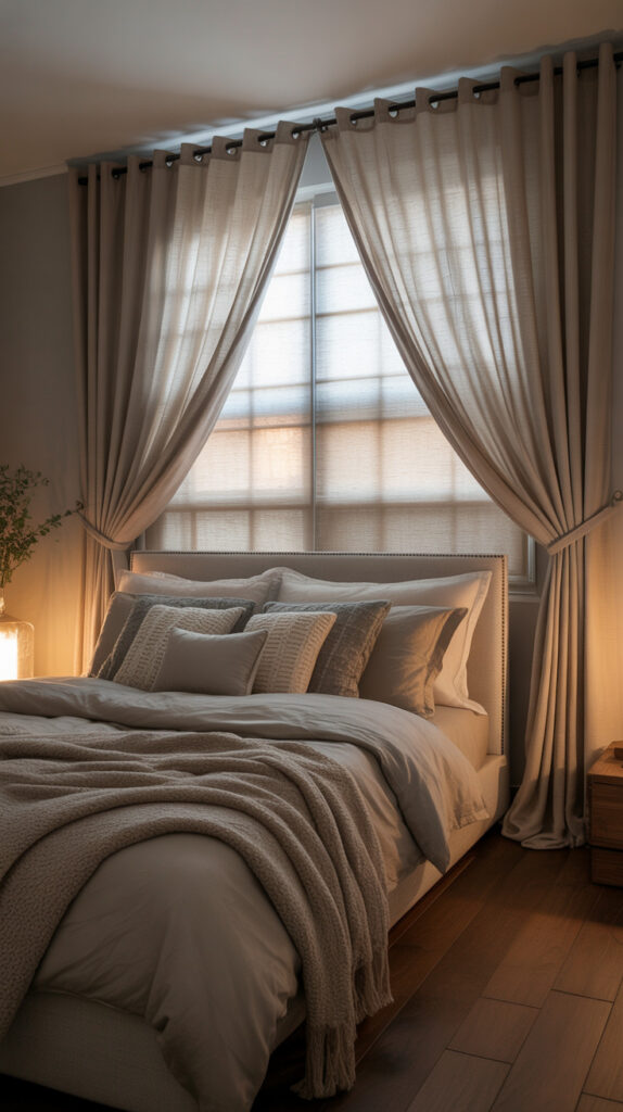 Keep the faux window clean and minimal to avoid looking theatrical. Neutral curtains work best, especially in linen or cotton blends. Symmetry helps sell the illusion, so center it carefully.