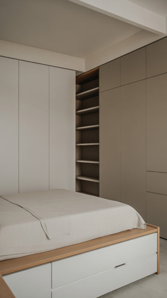 Match storage finishes to wall colors so they blend in. Flat-front cabinets feel quieter than decorative doors. Avoid open shelving unless styled very intentionally.