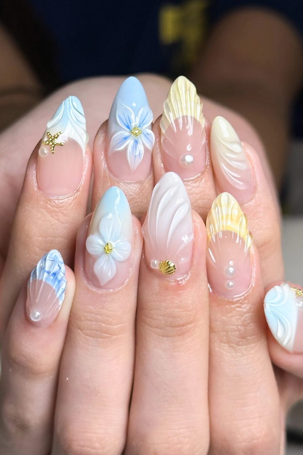 This one is giving total beach goddess energy. From the mini starfish charm to the pearly accents and wave-like textures, it’s like a mermaid bottled her vibe and dipped it in polish. The cool tones of sky blue and creamy yellow, combined with sculpted petals and golden shell accents, make it feel super luxe but still light and breezy. You can almost hear the waves crashing just looking at it.