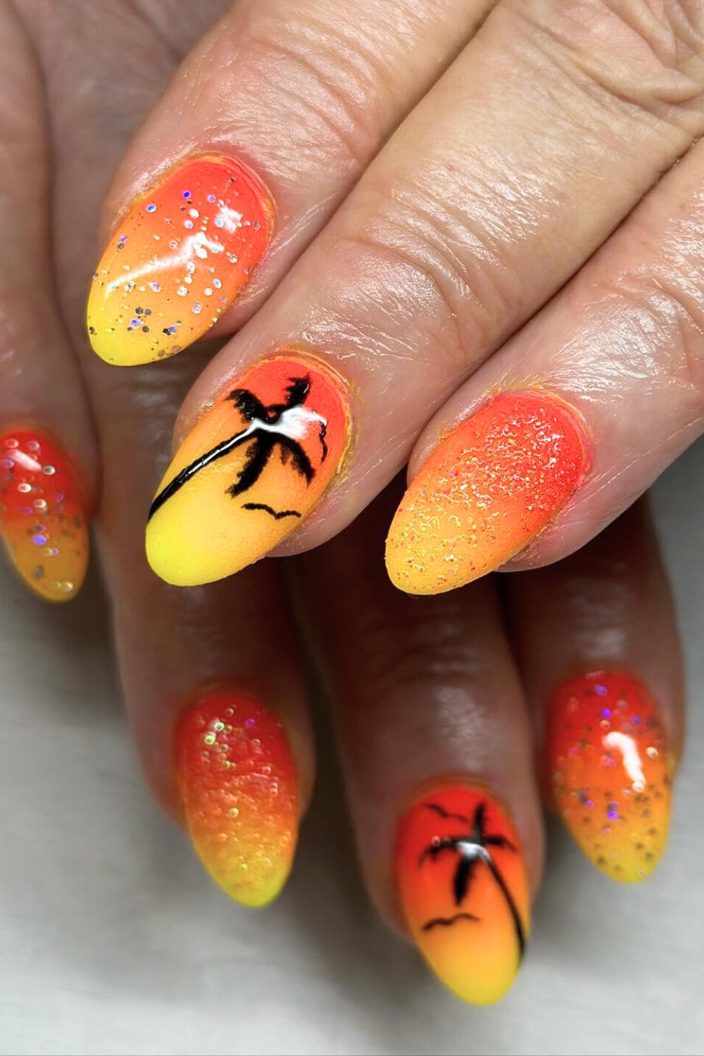 This one is basically a vacation sunset bottled up on your fingertips. That gradient from blazing orange to golden yellow? Straight-up tropical heat. The glitter overlay gives it sparkle, but it’s the palm tree silhouettes that seal the deal—they’re like little postcard moments with every flick of the wrist.