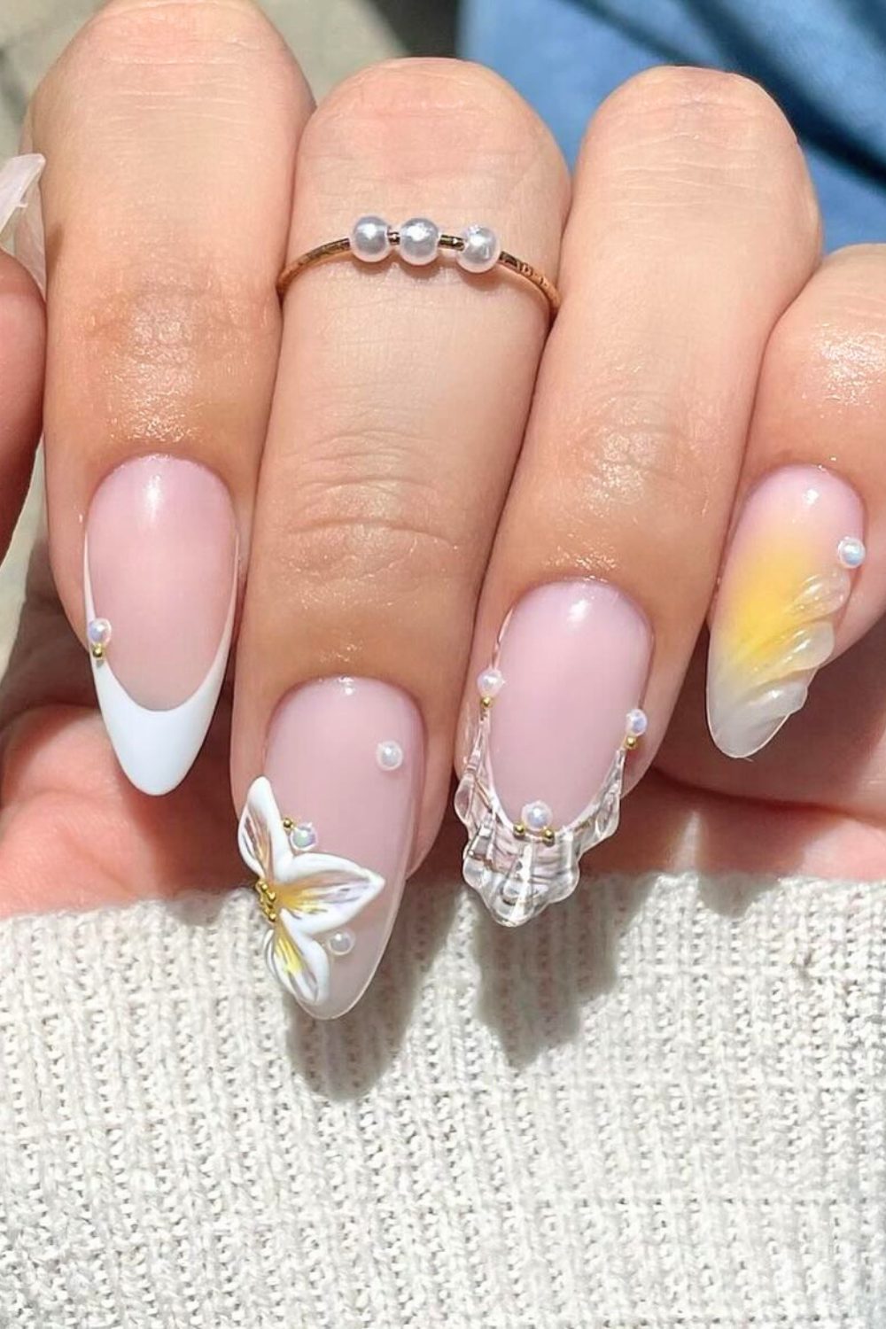 Now this is elegance meets beach bride. These nails are soft, classy, and totally ethereal. Between the sheer nude base, delicate white French tips, pearl embellishments, and 3D flowers—it’s giving romantic oceanfront ceremony. That clear sculpted nail with crystal drips? Stop. Just stop.