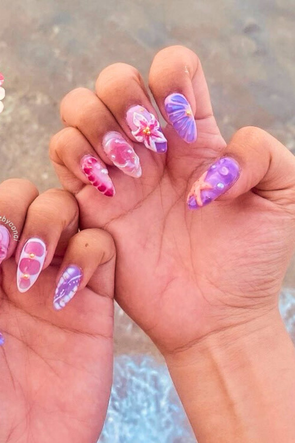 This post is serving 23+ swoon-worthy styles that cover everything from soft and classy to bold and bright. Whether you’re into floral vibes, 3D seashells, neon pops, or mermaidcore magic—there’s something here for every beach babe. Let’s find your next favorite look together!