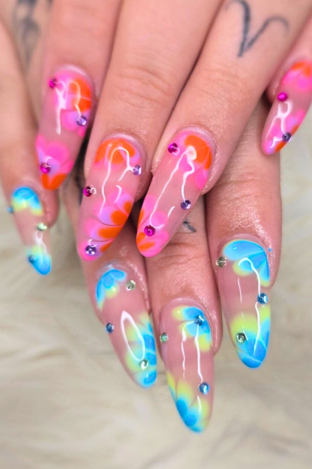 OMG. This set is like a beach rave in flower form! Neon pink, electric blue, and glowy lime all blend into the cutest retro flower power shapes, with little rhinestones giving that extra sparkle. The soft blend from clear base to color bloom is just so smooth—it’s giving 90s jelly sandals and pool parties.