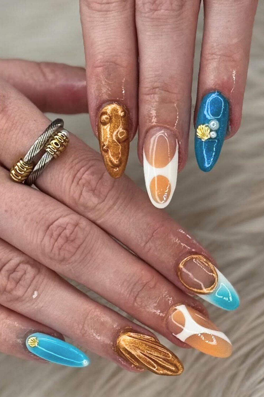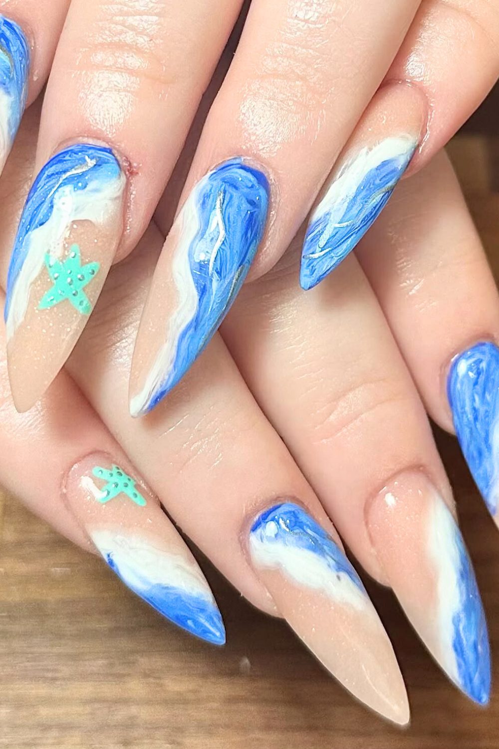 If you want something that feels light, pretty, and a little bit magical, this is it. It’s calm, it’s coastal, and it totally makes you want to book that beach trip already. This is the kind of mani that turns heads and makes you feel zen.