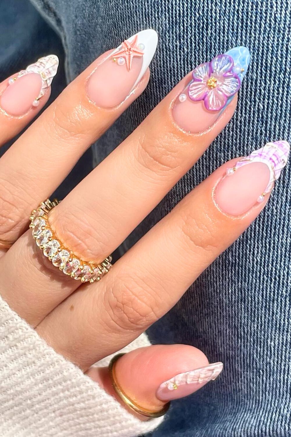How cute is this?! With a glossy nude base and dreamy 3D seashells, this set leans all the way into elegant mermaidcore. The pastel purple plaid, soft florals, and coral-pink starfish feel like a Pinterest board come to life. And the mini pearl drops? Instant romance.