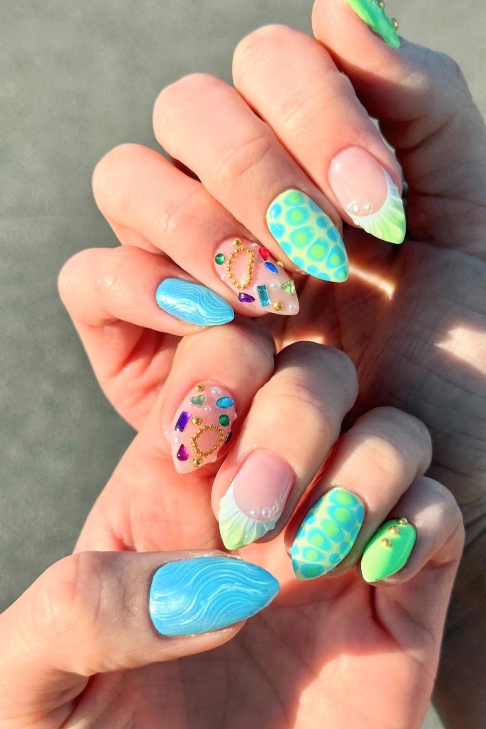 OMG—how fun is this one?! If you’re into bold color combos and playful vibes, this set is basically your tropical getaway in nail form. Bright lime, ocean blue, and a pop of neon pattern meet pearl details and 3D bling to make each nail feel like a mini party. That blue ripple texture on the thumb? Obsessed.