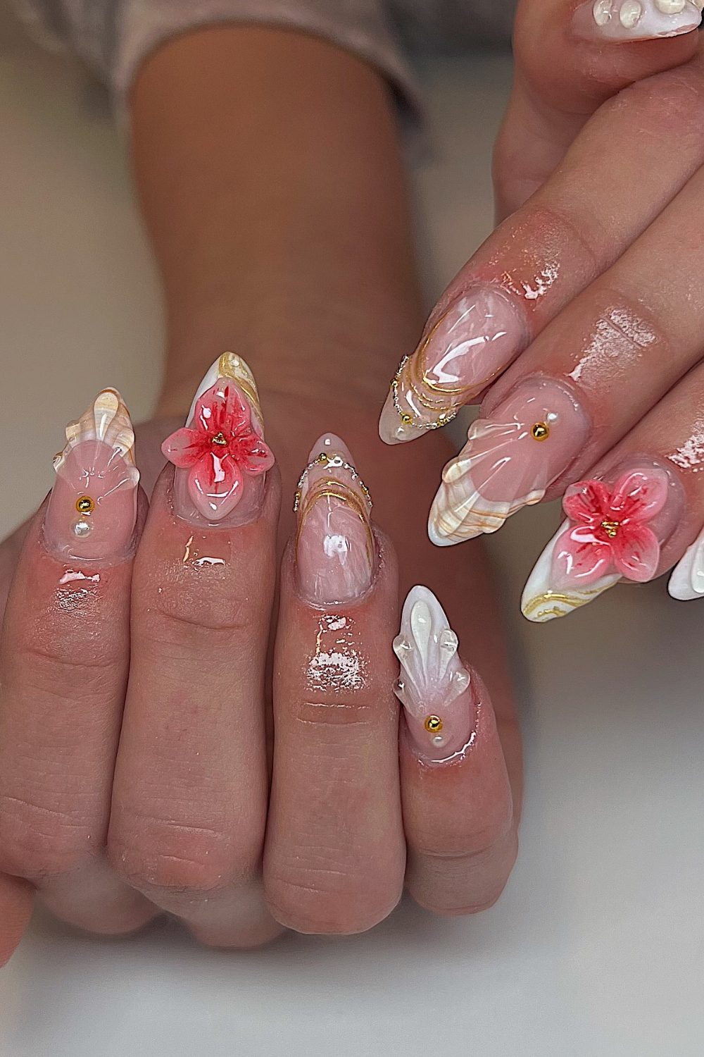 This one is the tropical escape your nails need. Featuring 3D hibiscus flowers, creamy nude tones, and gold foil details, it’s giving beachside spa day meets vacation glam. Each nail feels hand-sculpted with love—especially that wave-textured tip and seashell effect. And that hint of blush pink? Chef’s kiss.