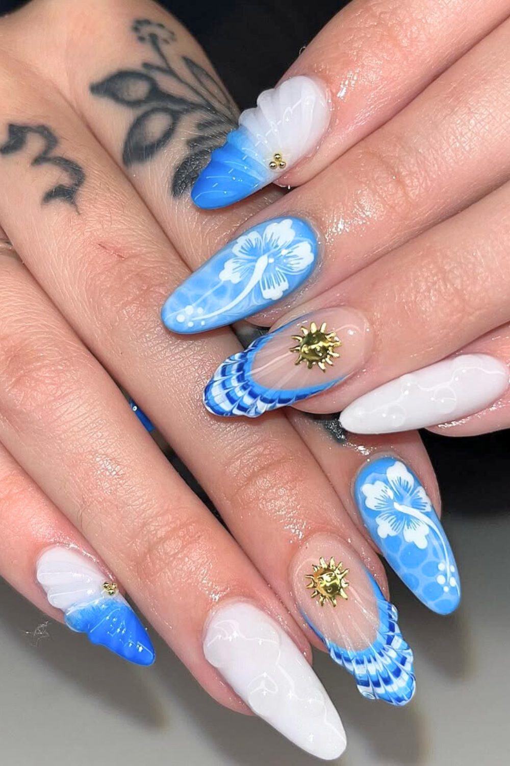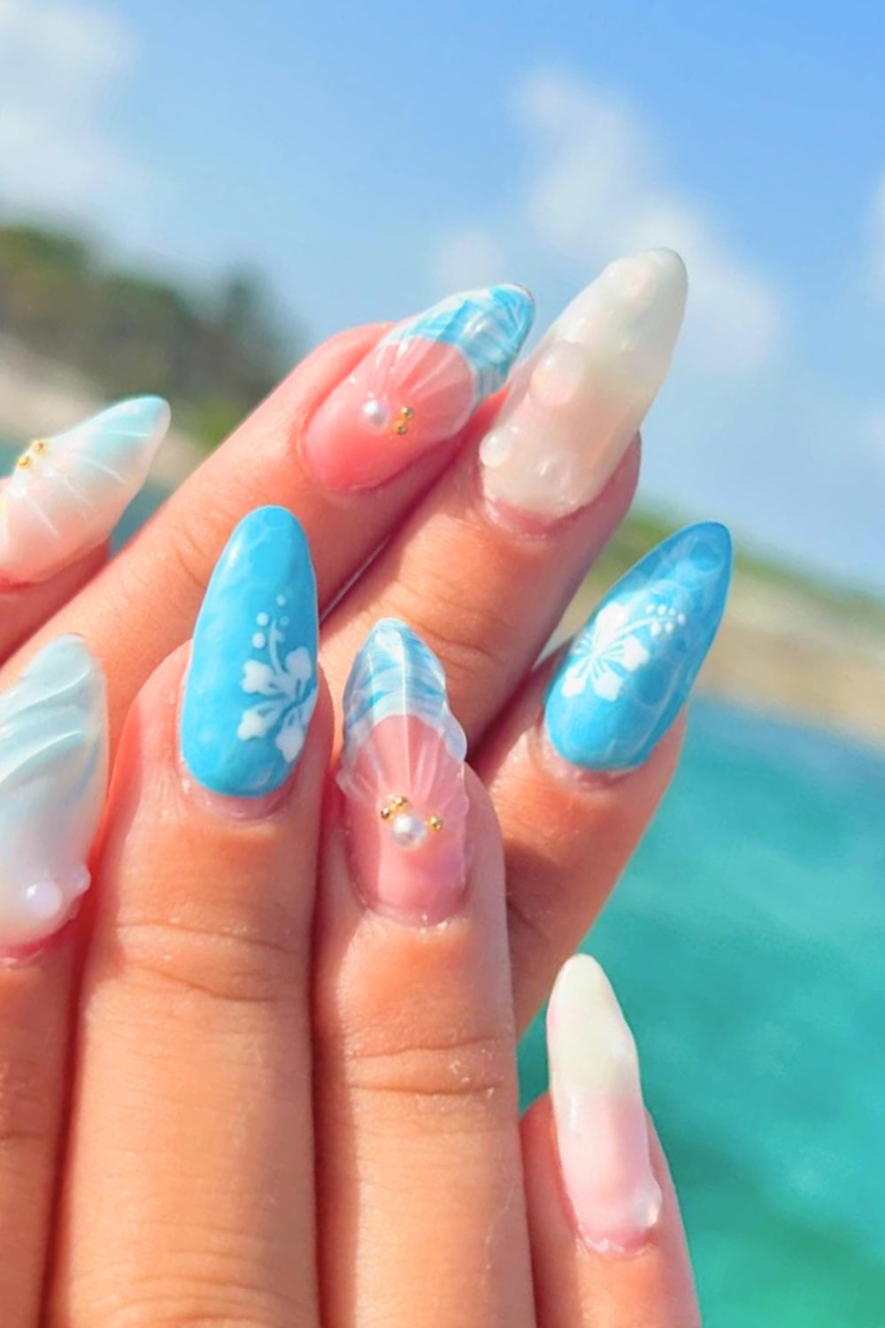 Here’s a nail look that’s seriously glowing. The mix of bright ocean blue and crisp white gives off cool, breezy waves—but it’s those golden sun charms that make this mani shine. Literally. Add in the delicate hibiscus florals and sculpted shell details, and you’ve got a design that’s equal parts tropical vacation and royal core fantasy.