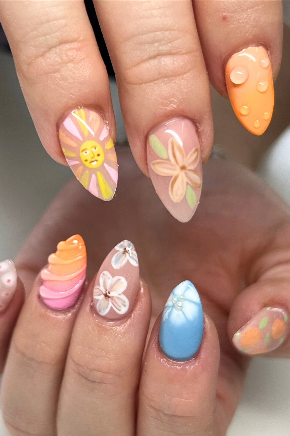 This set is like a summer sunset turned into nail art—bright, juicy, and totally joyful. The little sunshine face, pastel florals, and swirly sherbet ombré are giving major end-of-day glow feels. That orange nail with the 3D water droplets? OMG, it’s like you’re sipping a tropical drink with beads of condensation glistening in the golden hour.