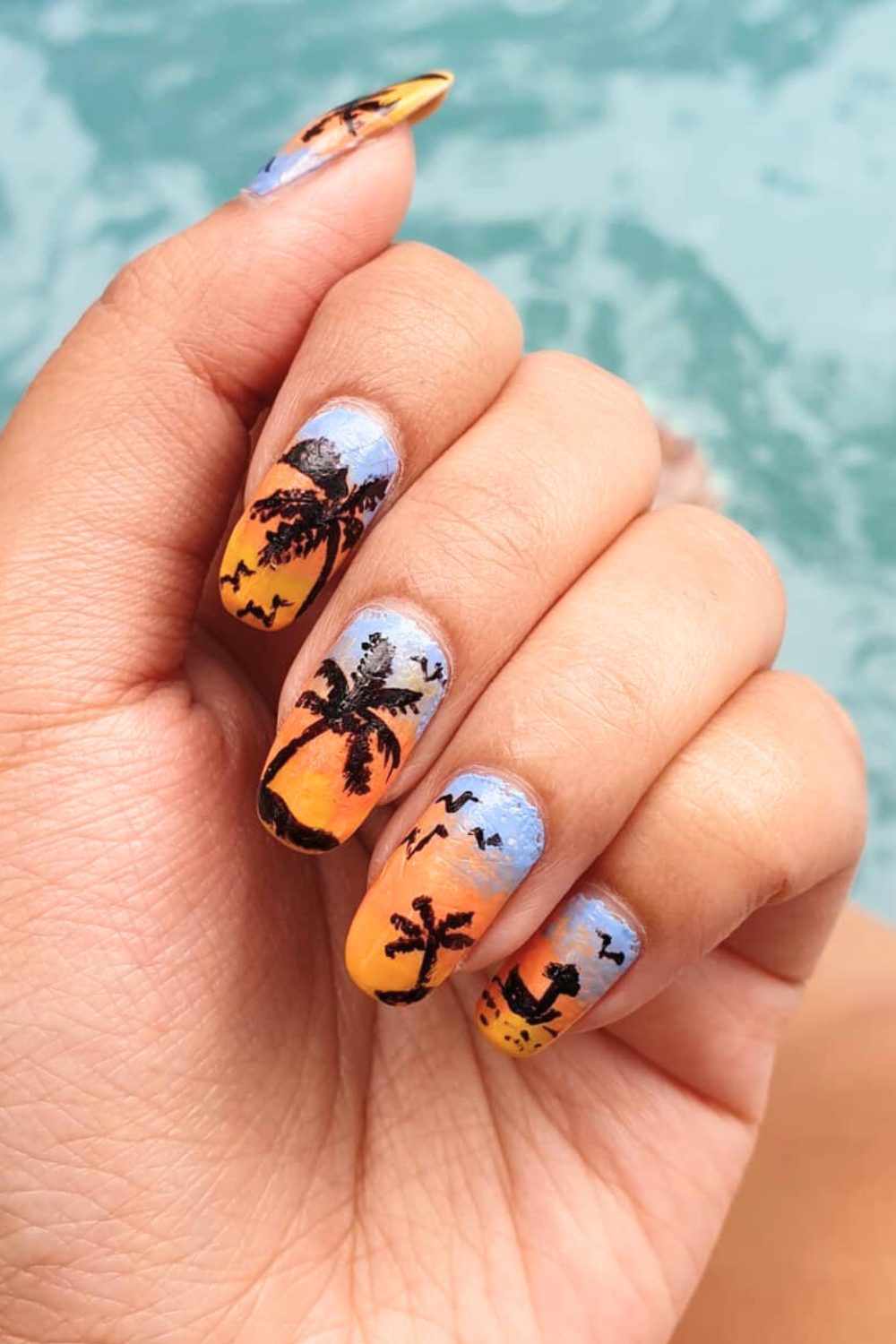 If you’ve ever dreamed of bottling up a tropical sunset and wearing it on your fingertips—this is it. These nails are giving major beach-at-dusk vibes with their vibrant orange-to-blue ombré base. And can we talk about those palm silhouettes and tiny birds in flight? It’s like watching the sun dip into the sea while you’re barefoot in the sand.