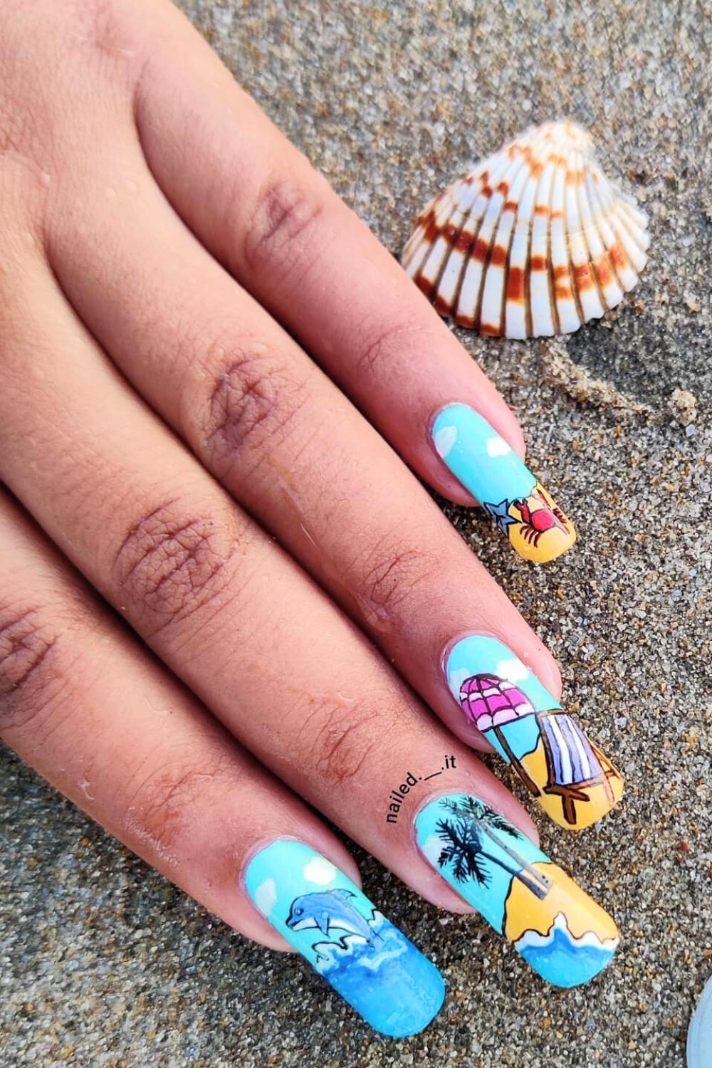 Whoa, this one’s a whole underwater adventure. That deep ocean blue gradient? Chef’s kiss. And the hand-painted dolphins, shells, and palm silhouettes are giving serious artistry. Like, each nail is a mini vacation story.
