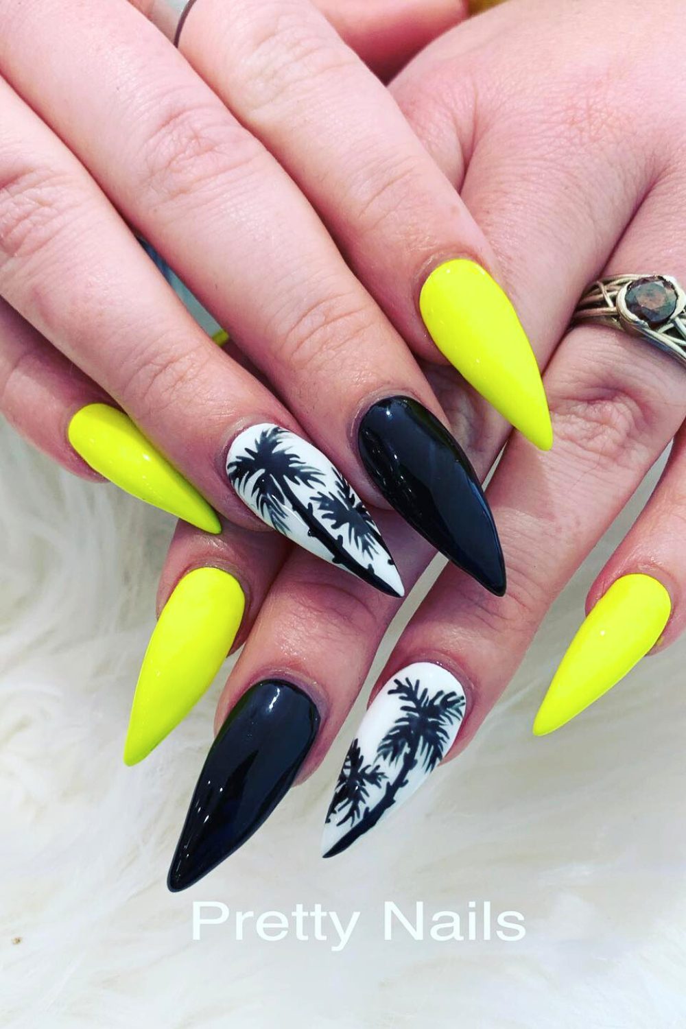 Talk about a bold punch! These stiletto nails are rocking the brightest neon yellow and sleek black, paired with white nails stamped with those classic tropical palm silhouettes. This look is for the daring beach queen who wants her mani to speak up.