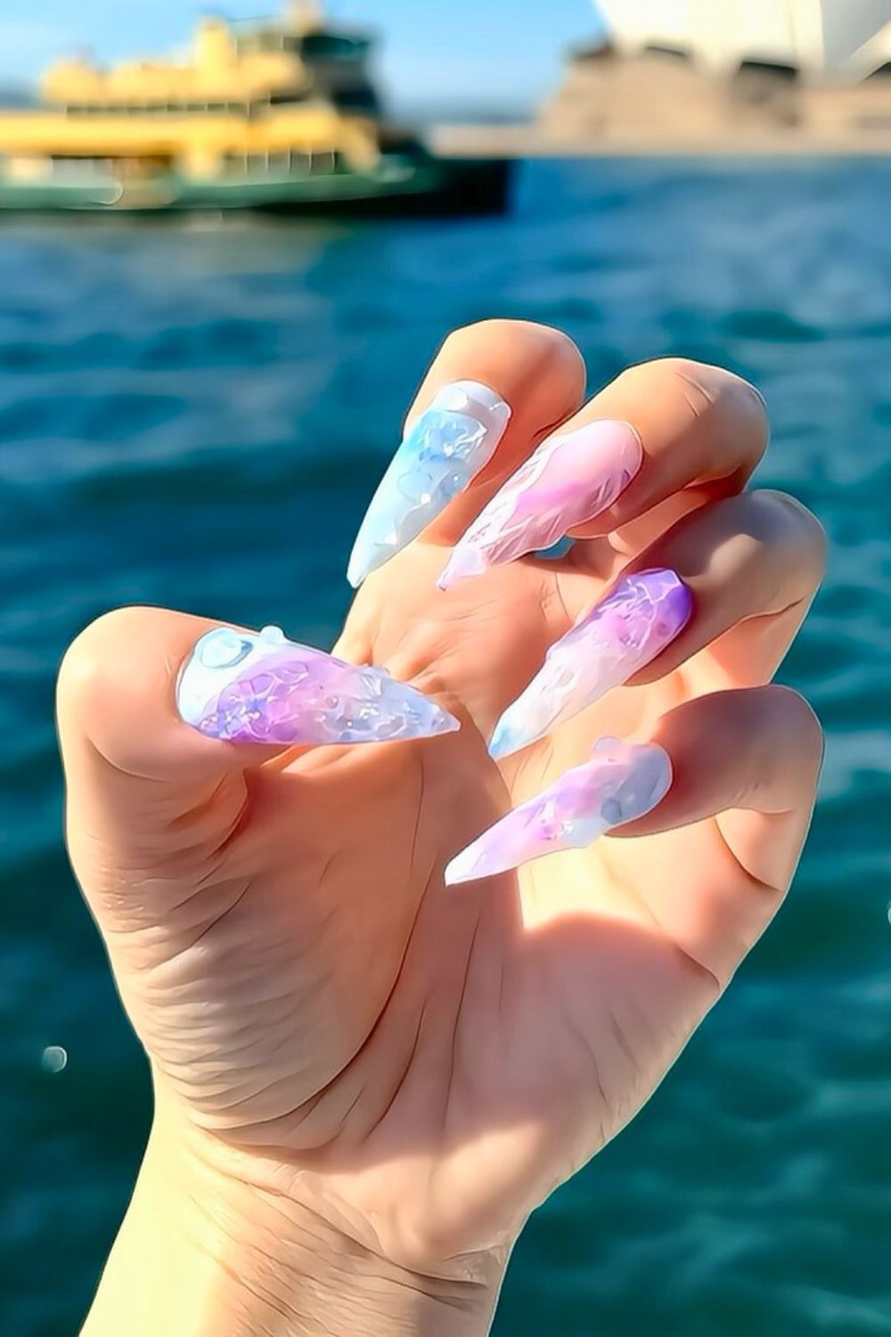OMG, it’s giving under-the-sea fantasy ✨ These long, sharp stiletto nails are packed with translucent jelly layers, glittery flecks, and soft dreamy hues. From soft blues to lavender and cotton candy pinks, it literally looks like ocean waves caught inside glass.