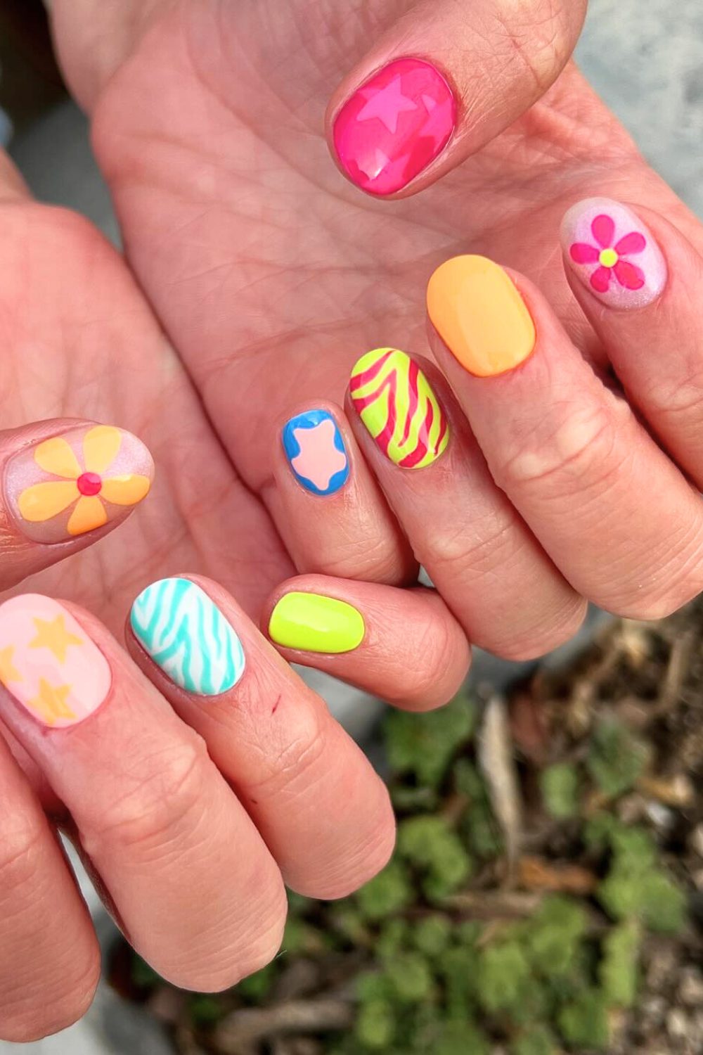 This one’s like a beach party in nail form—seriously! Each nail tells a different story: flowers, stars, neon zebra stripes, and polka dots, all in juicy bright colors. It’s the kind of mani that screams: “Let’s go dance barefoot in the sand!”