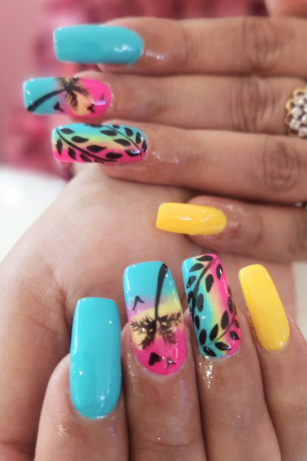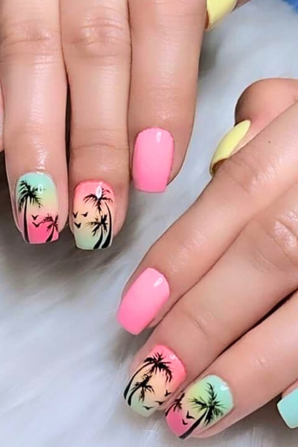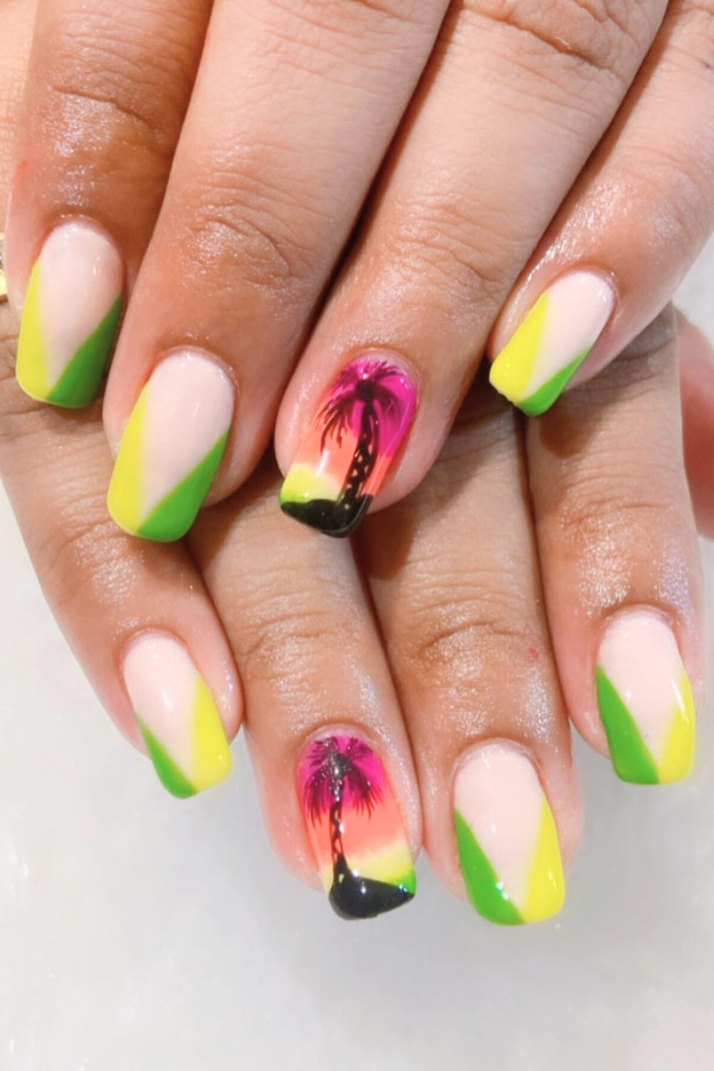 If vacation had a nail mascot, this would be it. These nails mix a soft, natural base with bam! neon green and yellow diagonal tips. But wait for it—the accent nails? A hot pink-orange sunset fade with a bold palm silhouette. Literal tropical postcard energy.